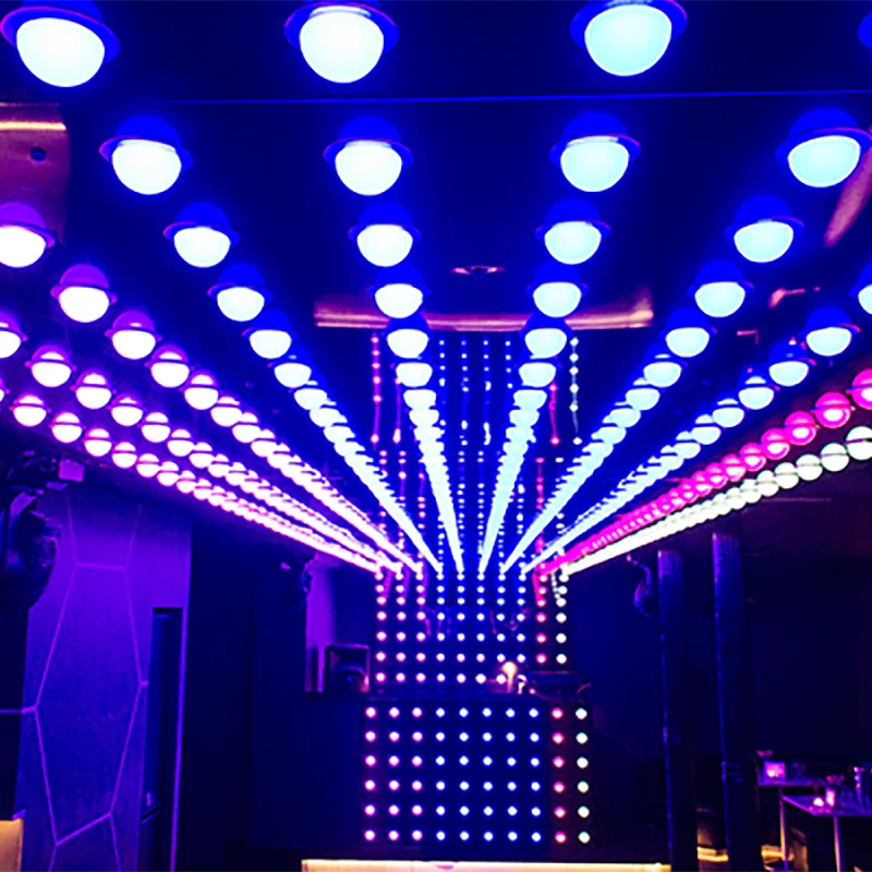 5. Õhusüsteem + 3D-valgustuse paigaldus: Pixel Ceiling + LED 3D Pixel Balls. See sidumine tõstab projektikoha tasasest kahemõõtmelisest laest täielikult kolmemõõtmeliseks ruumiliseks visuaalseks kogemuseks.