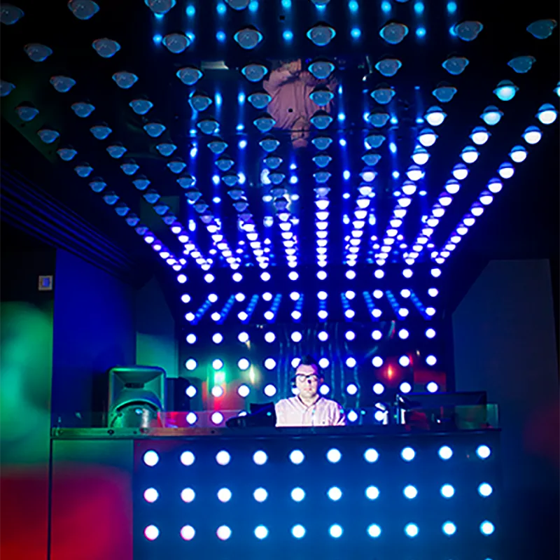 2. Overhead Visuals + Background Matrix System: Pixel Ceiling + Matrix Beam paneelid. Need elemendid täiendavad üksteist vertikaalselt, luues täielikult kaasahaarava visuaalse keskkonna, mis suudab kuvada sünkroonitud animatsioone.